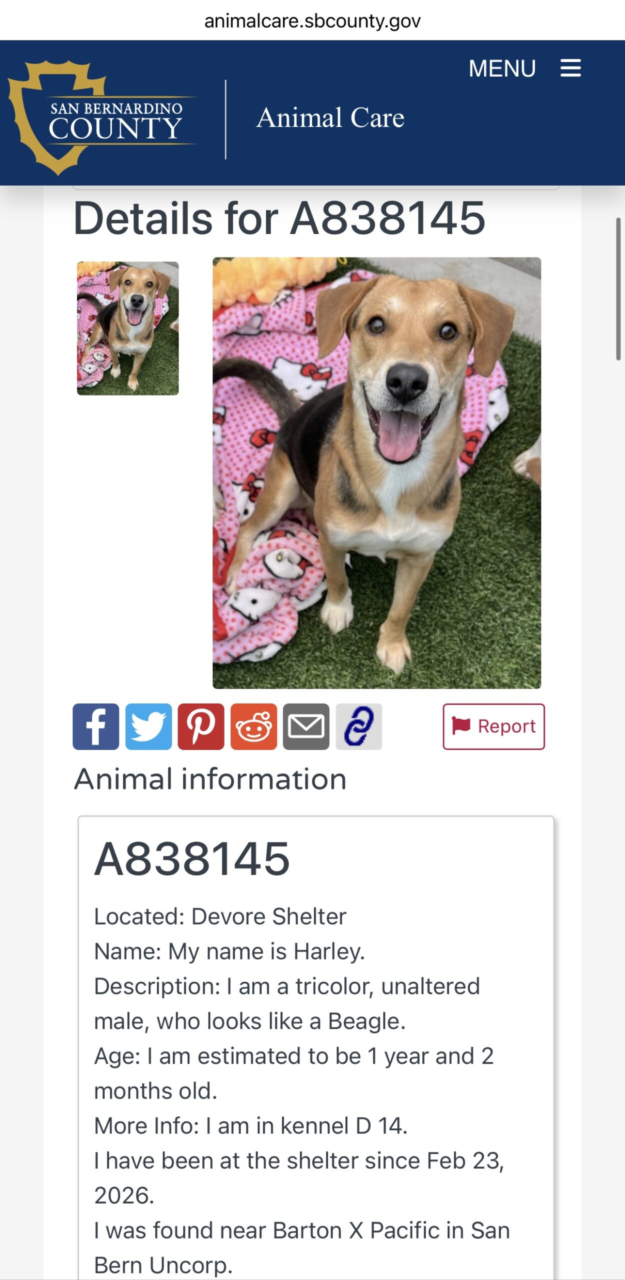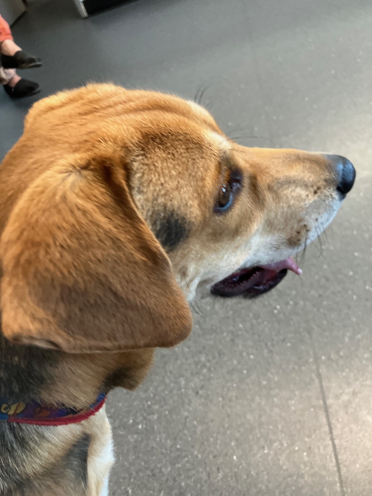 Harrison was Harley in the Devore Shelter. He had been there over a month until a volunteer emailed us that he was at risk and needed help, constantly overlooked. We rescued Harrison the next day and brought him back to Orange County. He is a 1 year old male beagle mix, found as a stray, and apparently good with other dogs at the shelter in the play yard and his kennel. Harrison went straight to our vet after his freedom walk and he is being neutered, examined, then will be headed to his foster home. Stay tuned as we learn more about this sweet boy.